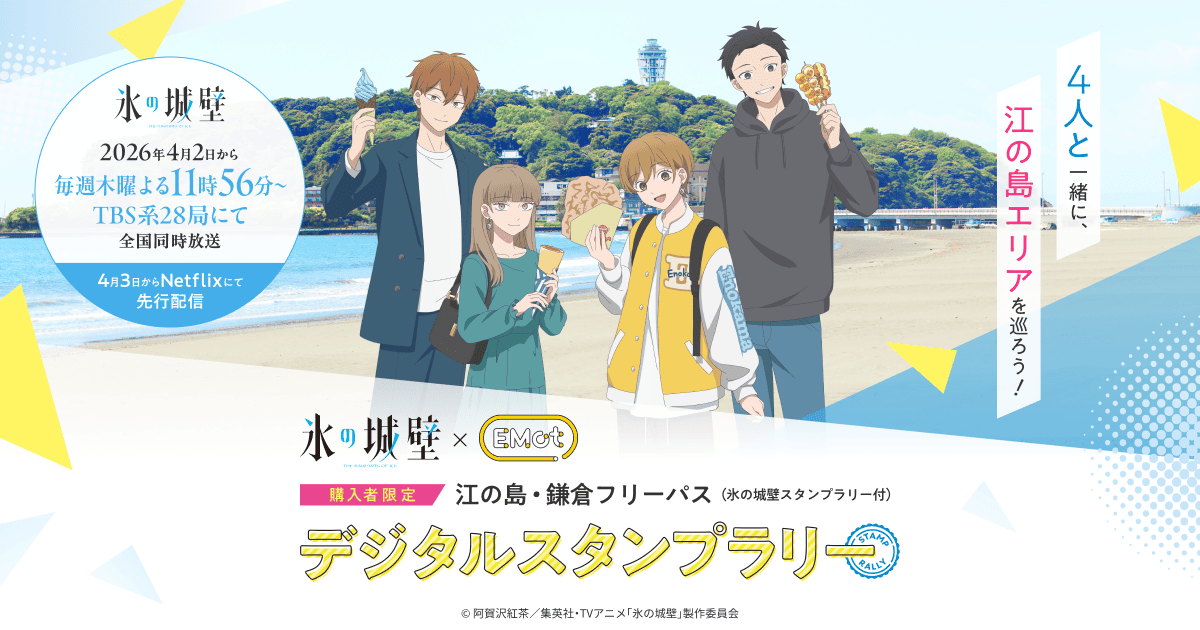 【公式】TVアニメ『氷の城壁』×小田急コラボ!デジタル江の島・鎌倉フリーパスで巡るスタンプラリー開催。限定のめじるしチャームやアクリルスタンドを手に入れよう。EMotで今すぐ参加!期間:2026年4月...