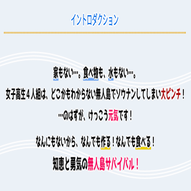 タイトル通りこの作品は、無人島に遭難するところから始まります。